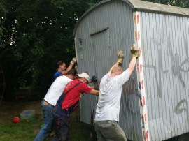 Ein auf dem Grundstück befindlicher Bauwagen, soll noch in diesem Sommer einen neuen und bunten Anstrich erhalten und demnächst neben Platz für Gartengeräte auch Raum für Forscherkisten bieten.